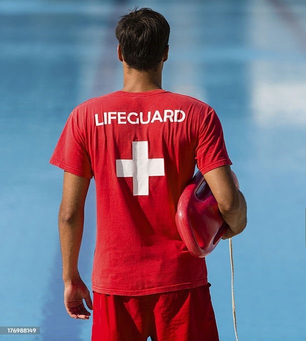 Rear view of male lifeguard with emergency equipment in red uniform watching swimming pool.